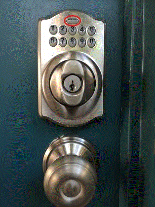 - Push the top button (labeled "Schlage", emphasized in picture with the added red oval) on the doorknob key pad. All of the buttons will light up.